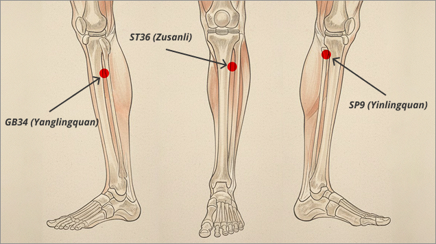stimulacija akupresurnih točk ST36, SP9 in GB34